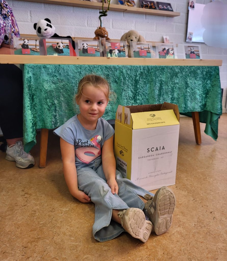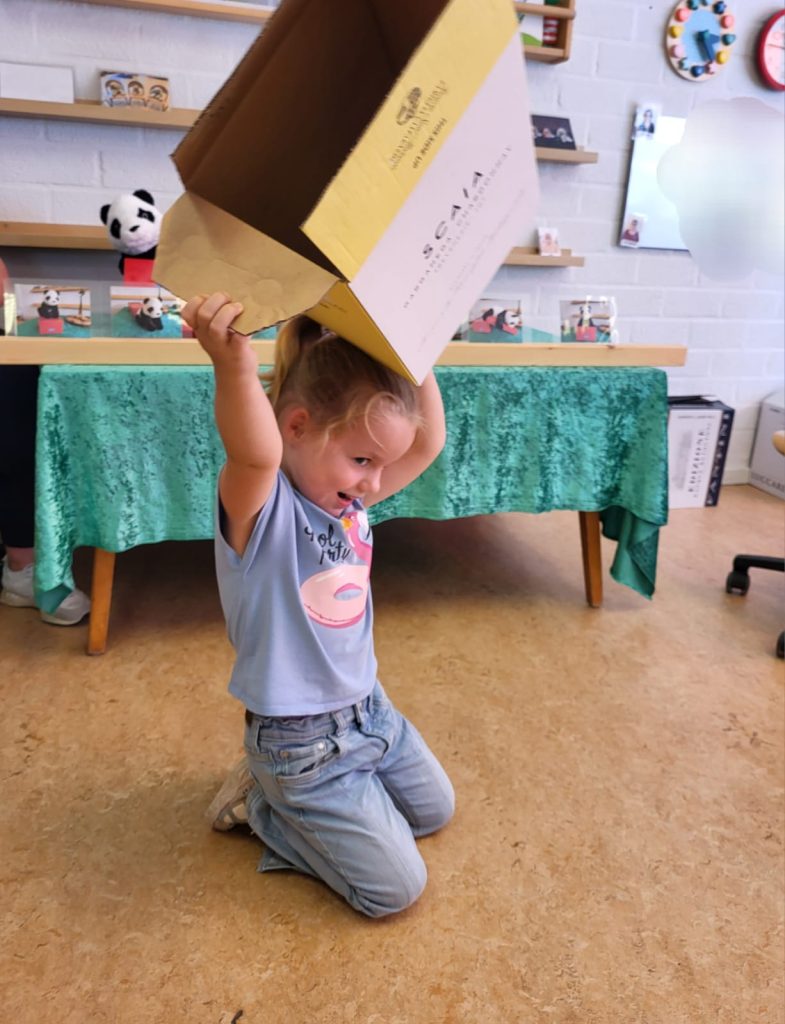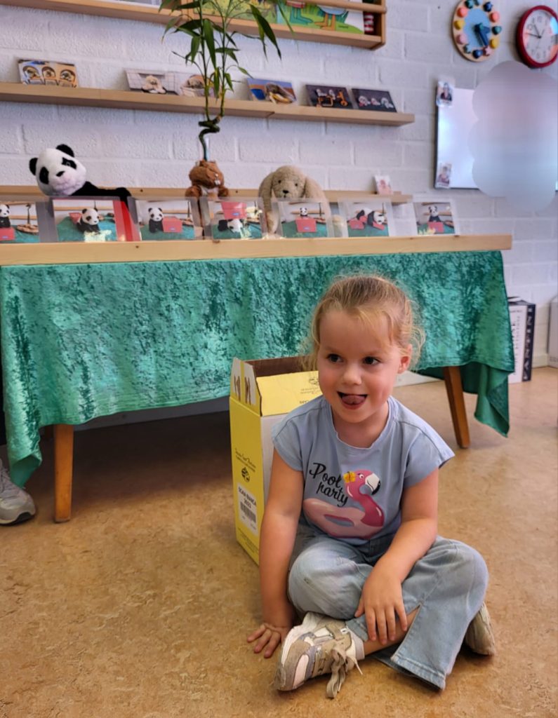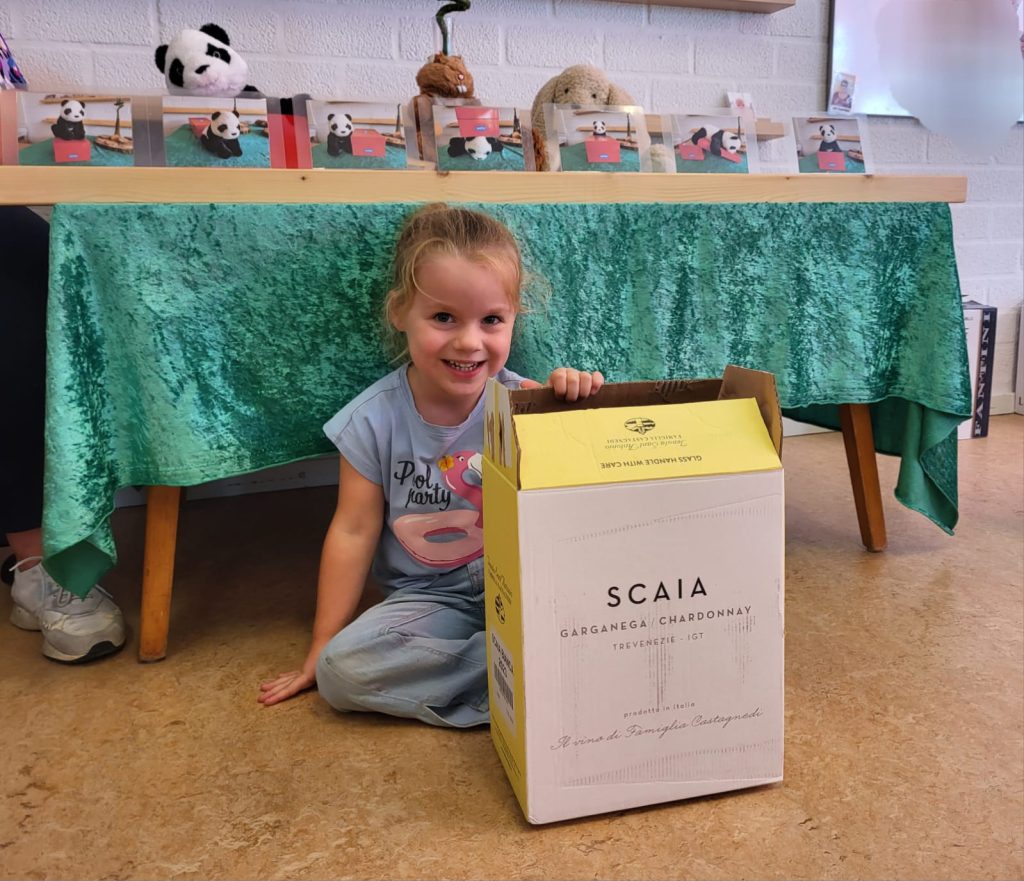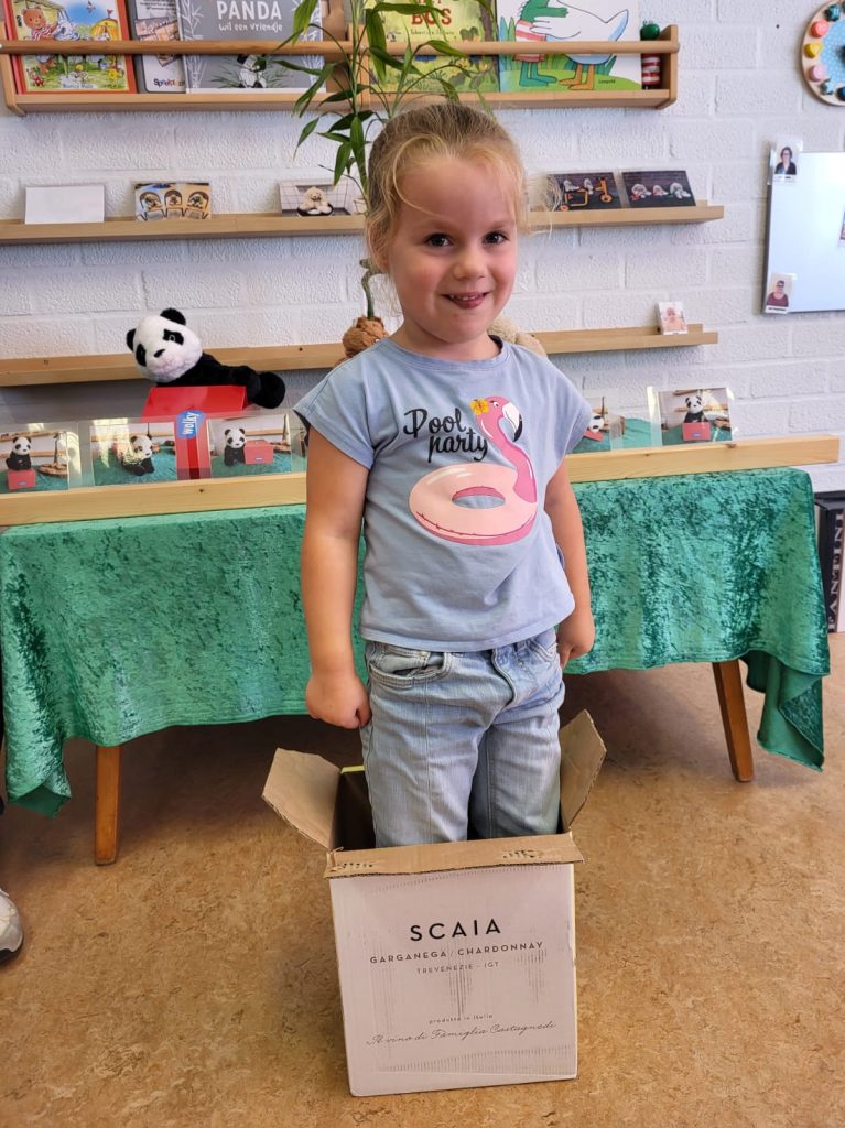 Net als Koen de panda: OP de doos, IN de doos, ACHTER de doos, VOOR de doos, NAAST de doos en…….ONDER de doos.