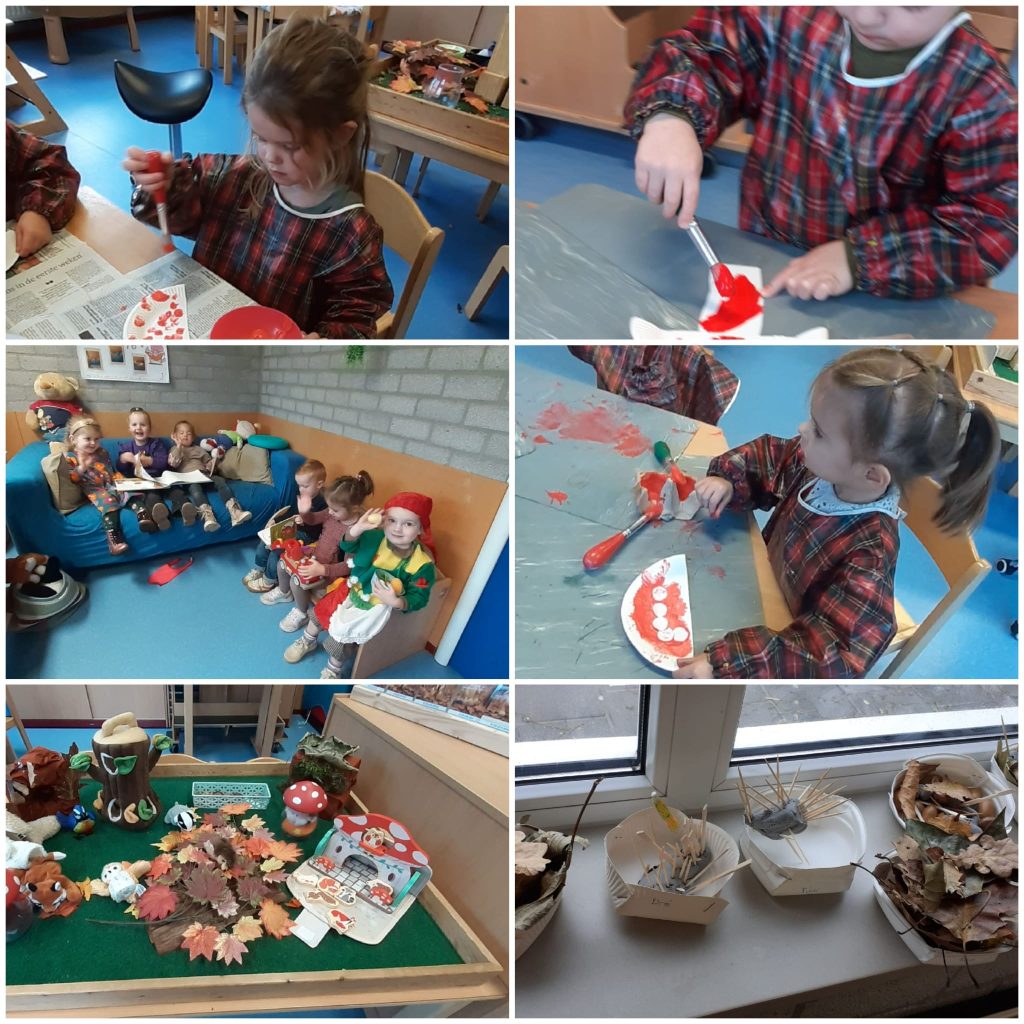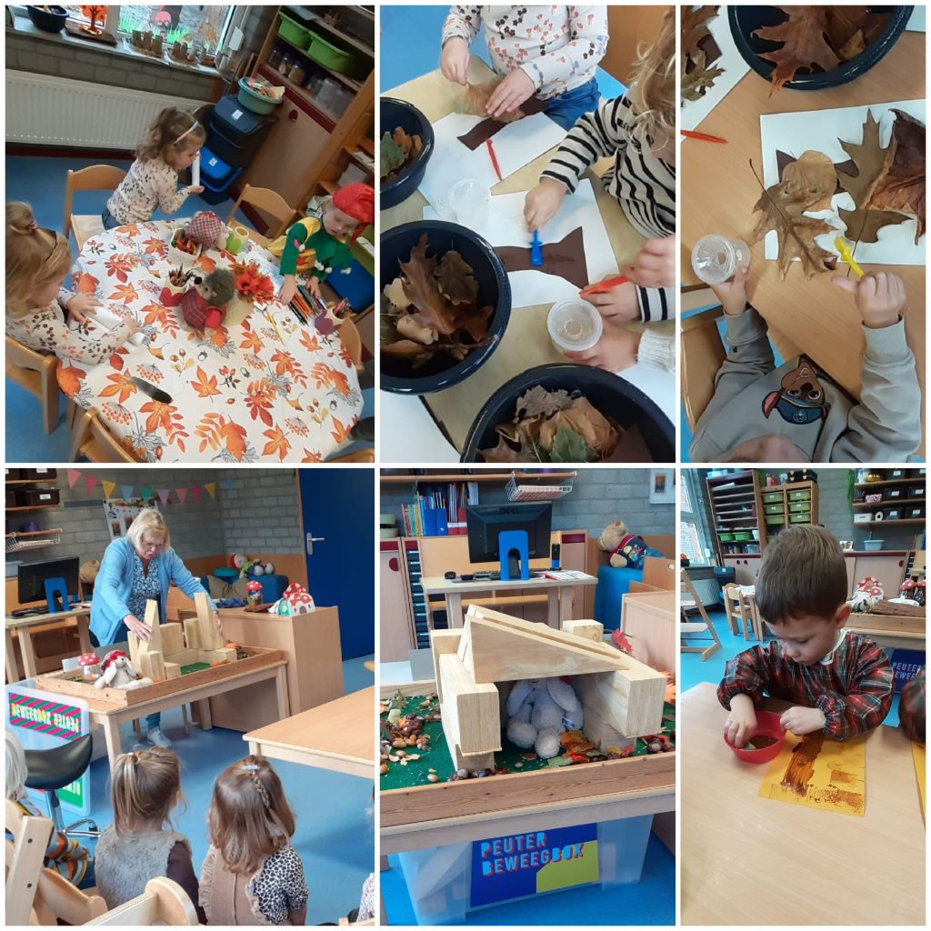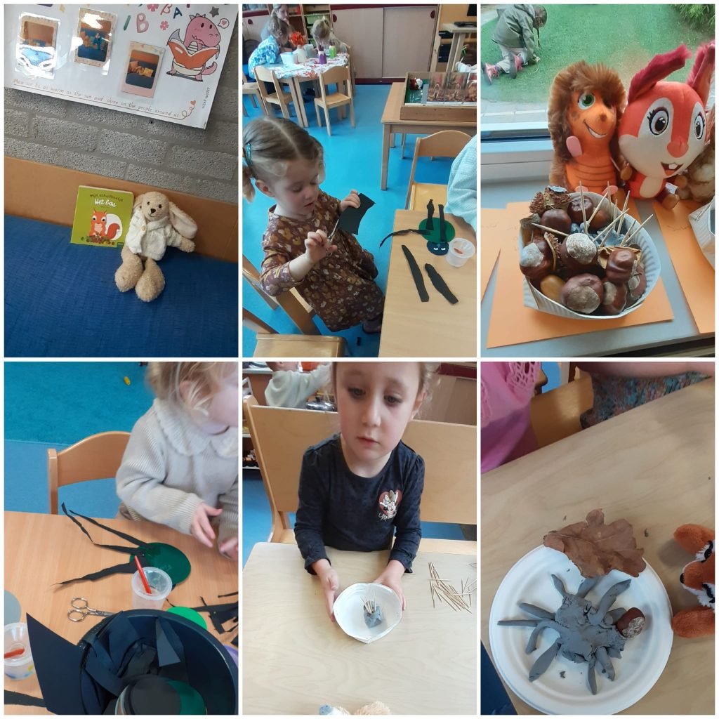 De dieren in het bos. Alle vriendjes waren er, de vos, de egel, de das, de vogel en de eekhoorn. Sommige verstopten zich in een holletje, anderen gingen in de boom zitten. We hebben dan ook egeltjes geknutseld van klei, en ..hé.. hoe komen die stekeltjes er nu op? Wat moet ik nu gebruiken? Ook de spin kwam aan bod met scheuren, knippen en plakken.