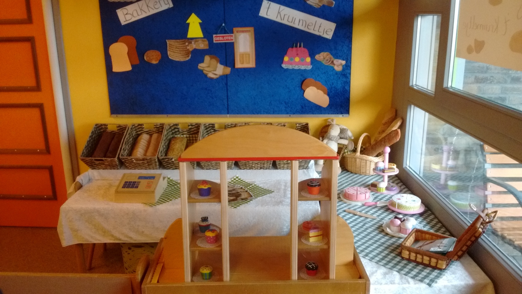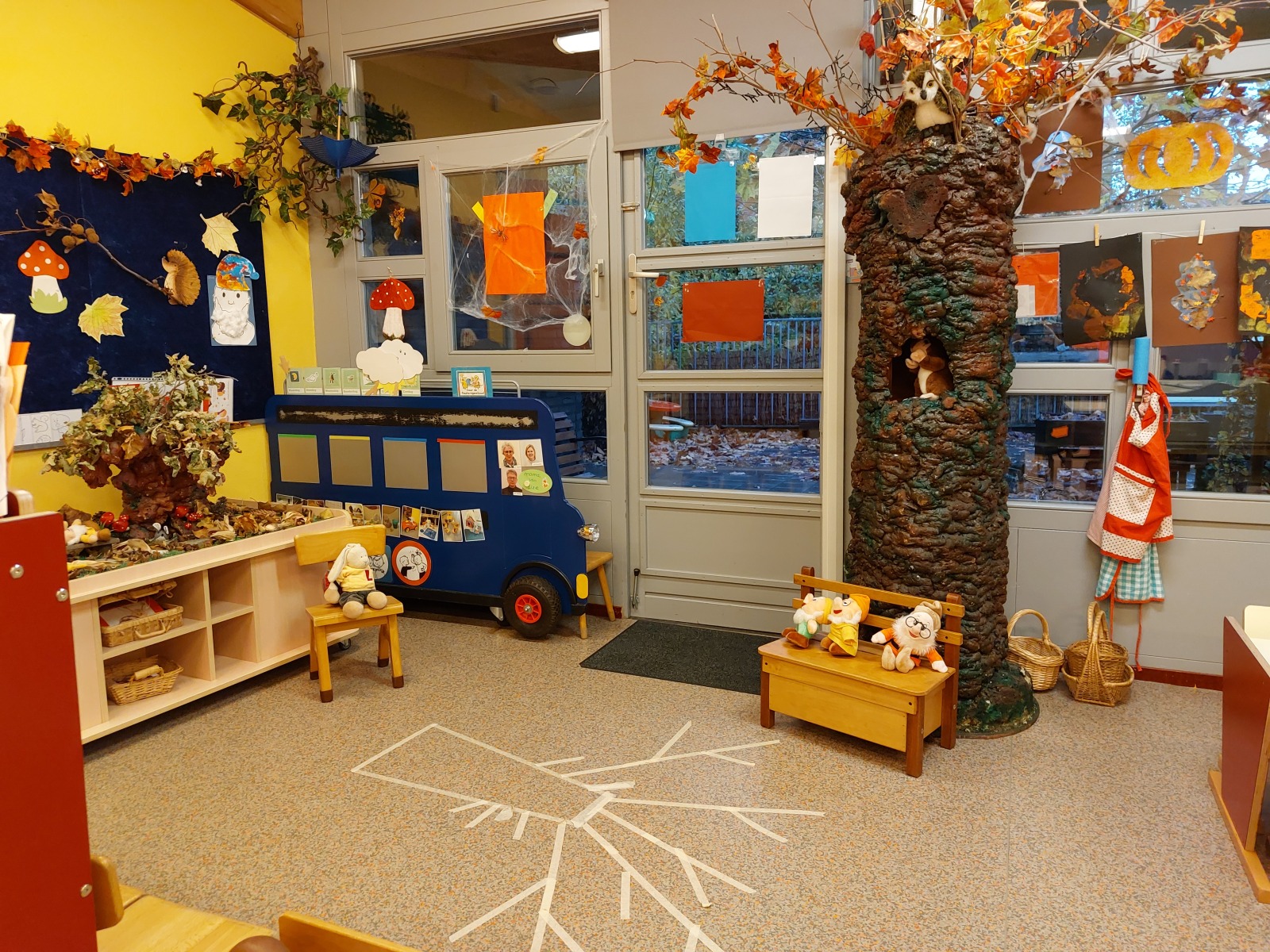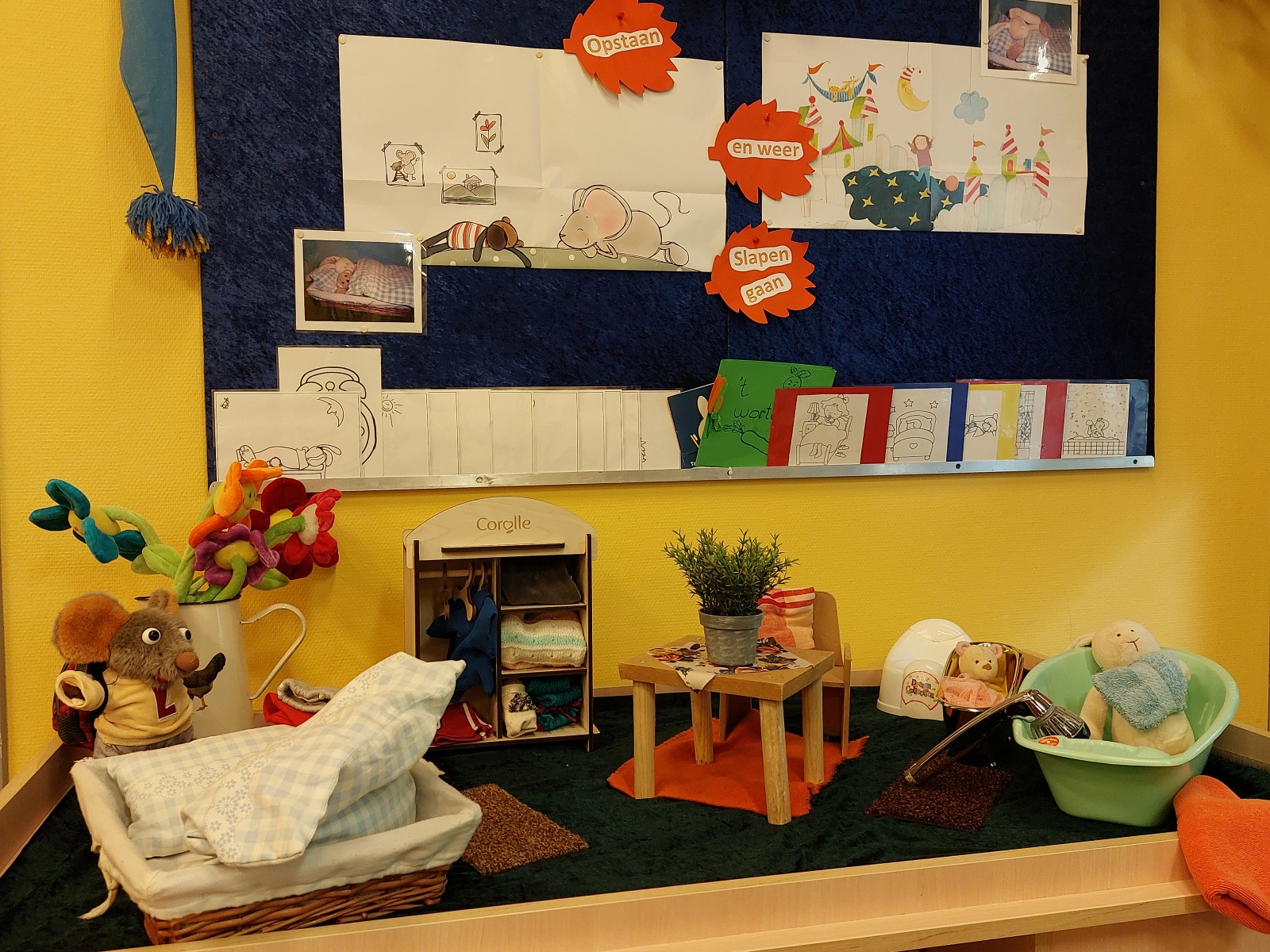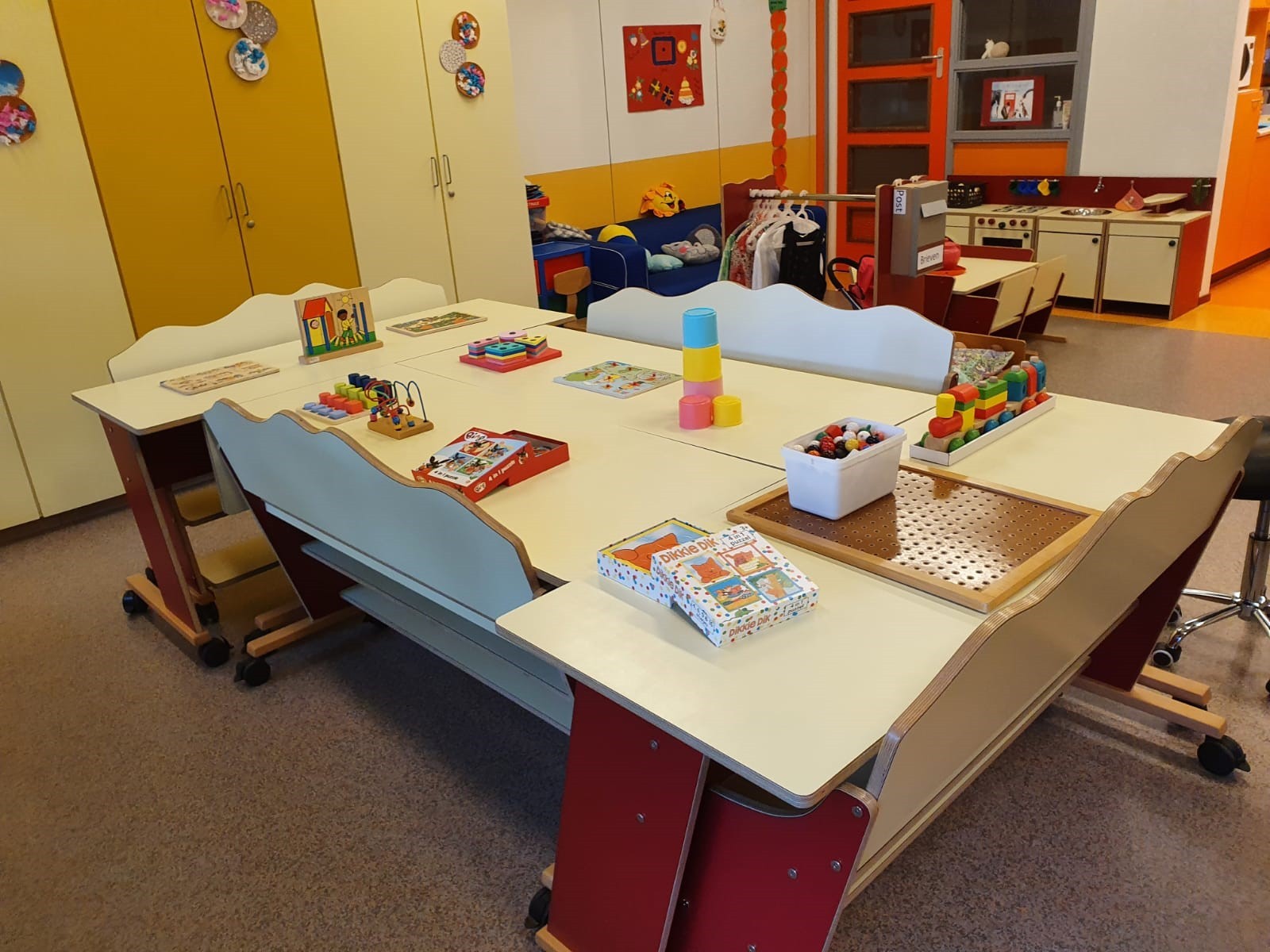 In de groepsruimte van ’t Kelderke hangt een gezellige, knusse sfeer. We werken in thema’s die je altijd terug ziet in de aankleding van de ruimte en de speciale thematafel.