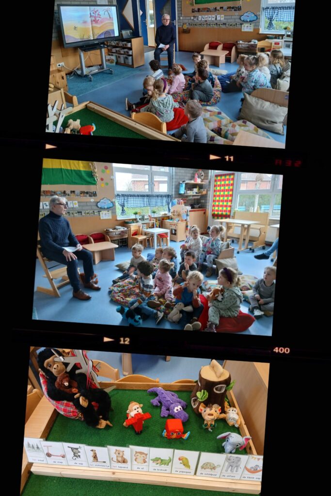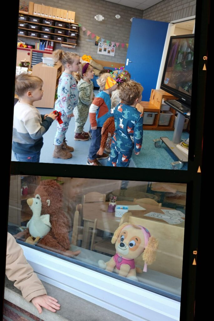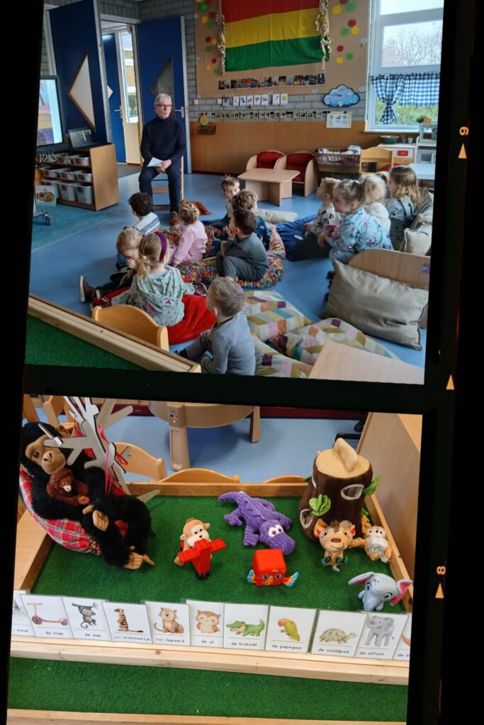 De kinderen mochten in pyjama naar school komen en hun knuffel meenemen. De kinderen startten de ochtend zoals altijd met vrij spel. Daarna hebben we samen geluisterd naar Peter Klein. Hij vertelde het hele verhaal middels afbeeldingen op het grote digibord. Er was veel interactie tussen de verteller en de kinderen.