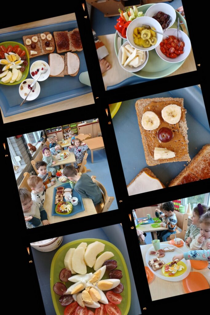 Terug in de klas wachtte ons een heerlijk ontbijt met bruine boterhammen. Deze waren als aapje versierd. Verder hadden we kip, jam zonder suiker, halfvolle yoghurt met muesli, fruit en komkommer.